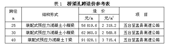 表1為五臺至盂縣高速公路的代表性孔跨工程造價表,供估算工程造價之用。