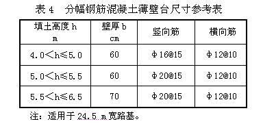 平原區填土高度h≤6.5 m的小橋,可采用薄壁臺,軟基段宜控制在6.0 m以下。現運營的高速路中有些薄壁臺出現開裂現象,設計時應特別引起注意。