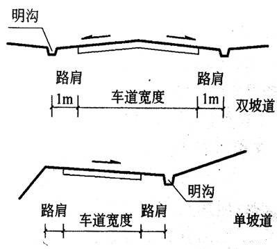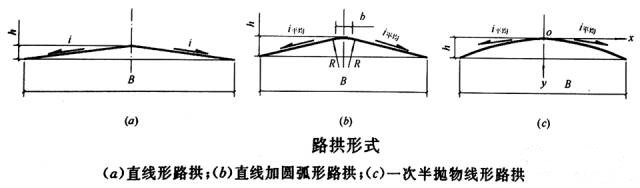 c)由于車行道寬度較大,為盡快排除地面水,車行道一般都采用雙向坡面,由道路中心線向兩側傾斜,形成路拱。拱頂到溝底的高度稱為路拱矢高或路拱高度。