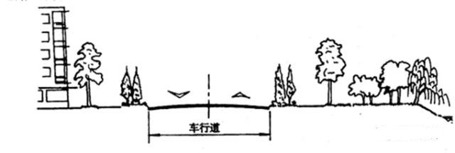 路面兩側不設高出的路緣石,而有保護路面的路肩,路肩外設明溝排除道路及兩側建筑用地的雨水;
