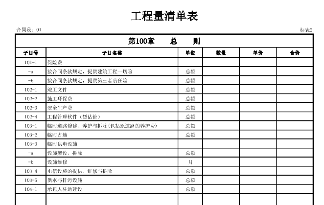 根據《公路工程標準施工招標文件》(2009年版),清單計價規則把全部非實體工程的計價內容全部放到第100章進行計價。對于這部分內容,由于目前尚缺乏相對規范統一和公平合理的費項內容和額度標準,使具體的編制和審核欠缺可操作的依據,給合理確定和有效控制造價帶來了難度,同時,由于標準不一、理解不一,各地各項目之間以及各標段之間招標人的要求也各不相同,給預算編制者造成很大的困惑。本文擬就100章的編制,闡述常用的做法和技巧。