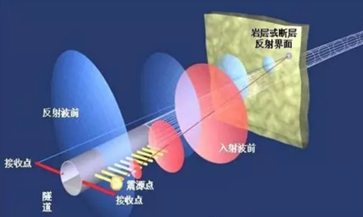 利用地震波在不均勻地質(zhì)體中產(chǎn)生的反射波特性來預報隧洞掌子面前方及周圍臨近區(qū)域的地質(zhì)情況,可以檢測出掌子面前方巖性的變化,可以在鉆爆法或TBM開挖的隧道中使用,而不必接近掌子面。該法有效預報距離100~200m。