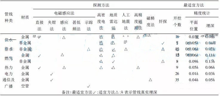 1) 各種管線類型最適宜探測(cè)方法的精度均能達(dá)到規(guī)范。