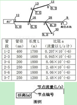 某城市采用枝狀管網(wǎng)供水,節(jié)點(diǎn)流量、地面標(biāo)高如圖所示,各管段長度、管徑、比阻見下表,節(jié)點(diǎn)4處設(shè)一高位水池,最高日總用水量120L/s,其中20L/s由高位水池供給,要求管網(wǎng)最小服務(wù)水頭為20m。