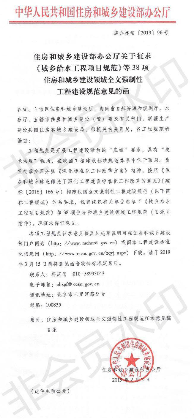 日前,住房和城鄉(xiāng)建設(shè)部辦公廳發(fā)布《關(guān)于征求<城鄉(xiāng)給水工程項目規(guī)范>等38項住房和城鄉(xiāng)建設(shè)領(lǐng)域全文強制性工程建設(shè)規(guī)范意見的函》,公布了《建筑和市政工程防水通用規(guī)范》征求意見稿。