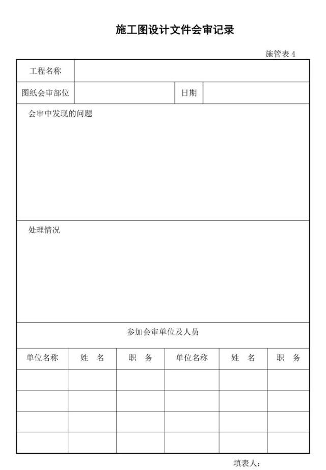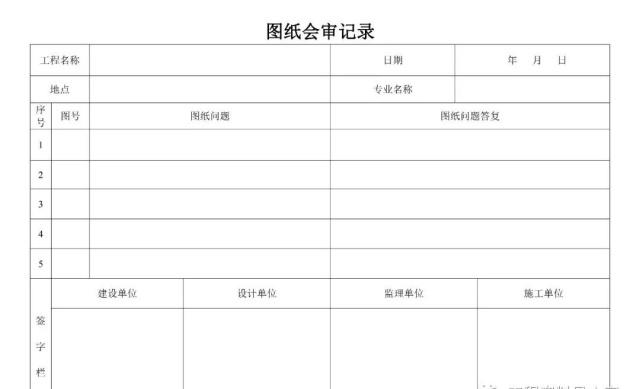 備 注:上表為城市(市政)道路工程國標使用表格,各地表格存在差異,優(yōu)先選用各地方要求的相應表格,其次考慮使用國標表格,再次為了方便圖紙會審分類管理,也可參考使用下表。圖紙會審記錄需各單位項目負責人簽字,加蓋公章,作為施工圖紙的補充,后期為結算工程量提供依據(jù)。(以上僅供參考)