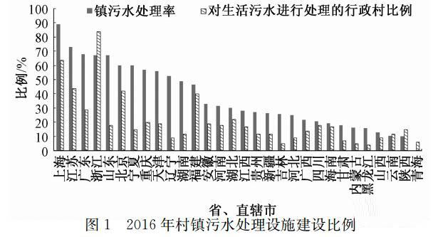 村鎮污水處理在我國剛剛起步,污水處理設施建設落后于經濟發展的速度。截至2016年底,全國對生活污水進行處理的建制鎮比例為52.64%,也就是說全國有18 099個建制鎮,其中13 028個沒有污水處理設施,同時已建成的污水處理設施不到一半尚可正常運行;對生活污水進行處理的行政村占20%。仍有大量地區的農村污水處理設施處于空白。圖1表明各省市行政村污水處理設施建設情況,地區差異較為明顯。上海、江蘇、浙江、山東等省市建制鎮污水處理率較高的地區可達到89.18%,行政村比例達到64%、44%、84%和18%,西北、東北地區僅為0.01%~25.7%??紤]到農村污水治理建設費用巨大、農村管理能力不足等因素,參照國外發達國家治理歷程,全面實現農村污水治理還需較長時間努力。當前,在大幅度提高建制鎮污水處理率基礎上,重點推動經濟發達地區、生態環境敏感、人口密集等地區農村污水治理,梯次推進農村生活污水治理。