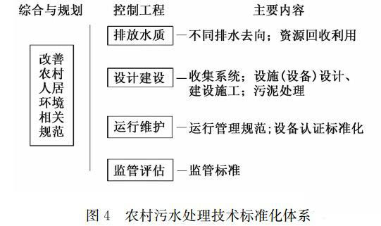 綜上所述,農村污水治理與城市模式有較大差異,應該盡快推進農村生活污水處理標準化體系建設,建立涵蓋從規劃到建設、運行、監管全過程的技術標準化體系(見圖4),確立完整的具有我國不同地域特征的村莊污水治理與管理模式體系。通過標準化規劃方法提升農村污水治理工作的整體水平,完善農村人居環境改善的相關法律法規。從排放水質、設計建設、運行維護和監管評估等環節借鑒國內外的成功經驗,在深入調查研究的基礎上,根據村莊污水的特征及排水去向,制定科學合理的農村污水處理目標。按照分類管理的原則,制定適合我國不同區域村鎮污水治理的工程建設及管理標準。健全村鎮污水治理的法規與標準體系。