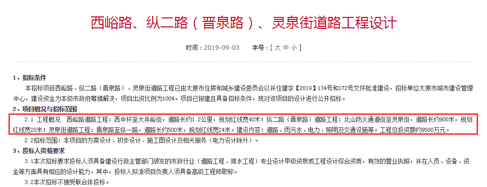 工程概況:西峪路道路工程:西中環至大井峪街,道路長約1.2公里,規劃紅線寬40米;縱二路(晉泉路)道路工程:北山防火通道街至靈泉街,道路長約900米,規劃紅線寬20米;靈泉街道路工程:晉泉路至縱一路,道路長約500米,規劃紅線寬24米。建設內容:道路、雨污水、電力、照明及交通設施等。工程總投資額約9500萬元。