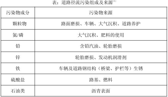 研究表明,道路徑流中污染物成分主要包括來(lái)源輪胎磨損、防凍劑使用、機(jī)械潤(rùn)滑的泄漏、殺蟲(chóng)劑及肥料的使用、廢物丟棄的顆粒沉積物、橡膠、金屬、油類等(見(jiàn)下表)。隨著城市道路和交通流量的飛速增長(zhǎng),路面污染物的累積量,不可避免的增加,并隨著道路雨水徑流進(jìn)入周邊水體或直接滲入地下,對(duì)我國(guó)城市水安全造成極大的威脅。