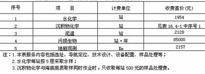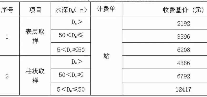 在《工程勘察收費標準》里,除了看2.3節(jié)里的“水域測量”部分外,還需要關注第16部分的“海洋工程勘察”部分,該部分對多波束海底地形測量,海底面狀況掃側,底質取樣,氣象、潮位、波浪觀測,海流、鹽度、泥沙觀測,海洋工程地質鉆探,海底地層測量,及其他海洋工程勘察項目,等等都作出了勘察收費依據(jù)。這里,海底面狀況掃側是指掃海測量,海底地層測量可以對應淺地層剖面測量。而海底地層測量又細分聲學地層探測、單道地震探測及多道地質探測三類。在其他海洋工程勘察項目部分中,地磁觀測可以與海洋磁力測量對應,另外還包括沉積物化學、污損生物、水化學等內容。