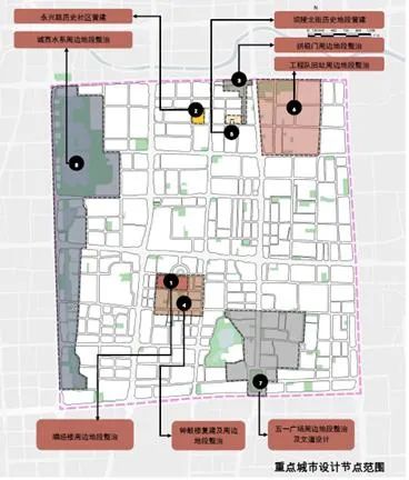 八個空間景觀節(jié)點包括:唱經(jīng)樓周邊地段、永興路歷史社區(qū)、拱極門周邊地段、鐘鼓樓復建及周邊地段、壩陵北街歷史地段、工程隊舊址周邊地段、五一廣場周邊地段及文道設(shè)計、城西水系周邊地段。