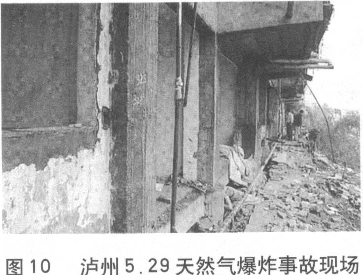 1.2006年8月30日上午,重慶市南岸區(qū)在進(jìn)行道路改造施工時(shí),挖掘機(jī)不慎將天然氣主管道挖破,導(dǎo)致天然氣猛烈外噴,氣柱高達(dá)近十米。事故發(fā)生后,上千戶居民被緊急疏散,未造成人員傷亡,當(dāng)?shù)鼐用竦娜粘I钍艿酵庥绊憽?br /> 2、2004年5月29日19時(shí)45分,瀘州市納溪區(qū)炳靈路15號居民樓人行道下,突然發(fā)生劇烈的天然氣爆炸事故,造成5人死亡,35人不同程度受傷,附近一樓10余居民的家園被毀,臨街一樓12間門面受損,近50米長范圍內(nèi)的街道被震得一片狼藉。事故的原因是:管道局部的防腐層受到外力破壞,導(dǎo)致腐蝕穿孔,該位置正好位于民樓附一層與道路堡坎形成的窄縫中,地勢較低,聚集大量天然氣,因氣候變化因素發(fā)生膨脹而釋放至窄縫外,與空氣形成爆炸性氣體,遇人行道上不明火源而引發(fā)爆炸。