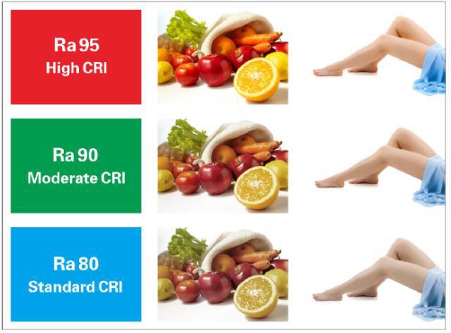 是指物體被光源發(fā)出的光照明時色彩被還原的真實程度。白熾燈的顯色指數(shù)為100,也就是說它對于色彩的還原性可以做到100%?,F(xiàn)在市面上對于LED光源的應用越來越普及,住宅照明產品光源的顯色指數(shù)都應該要大于80,優(yōu)質LED光源的顯色指數(shù)能達到90以上甚至95,但是有一大部分的劣質產品其光源的顯色指數(shù)都不到70,所以用戶在選擇的時候一定要引起注意。下面關于顯色指數(shù)的對比圖可以有一個相對直觀的感受: