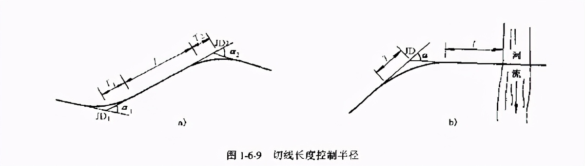 平曲線半徑的選定,除受地形、地物制約外,有時還應考慮如何適應前后線形的要求。如當同向或反向曲線間直線長度較短時,為解決曲線敷設與銜接,通常采用限制切線長度的方法來推求平曲線半徑,如圖1-6-9a)。橋梁或隧道兩端的曲線起、終點到橋頭或隧道口應留有一定長度的直線段,如圖1-6-9b).此時平曲線半徑也應根據切線來選定。