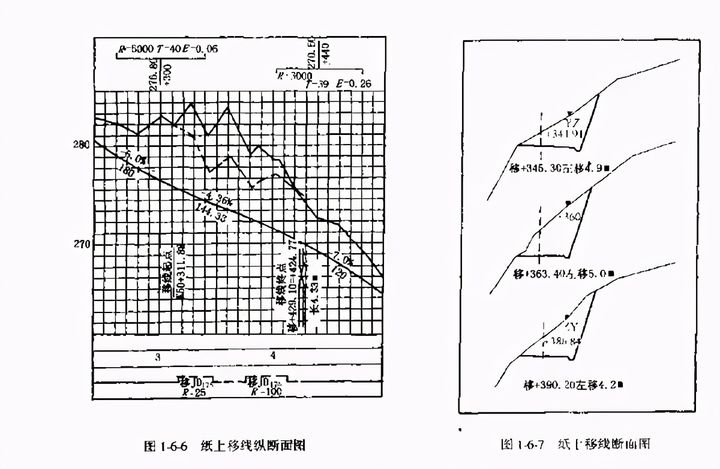 (3)根據縱斷面圖上各樁填挖值,在橫斷面圖上找出各樁最經濟或控制性的路基中心線位置。量出偏移原中心線的距離(即移距),分別用不同的符號標記在平面圖上。