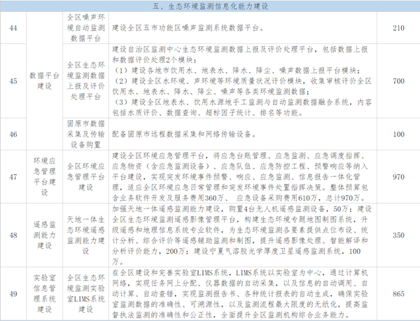 寧夏回族自治區(qū)生態(tài)環(huán)境廳印發(fā)《寧夏回族自治區(qū)生態(tài)環(huán)境監(jiān)測“十四五”規(guī)劃》,劃定60項(xiàng)重大工程,預(yù)算投資82812萬元。詳情如下: