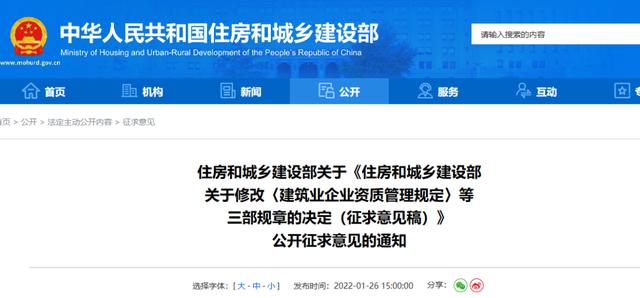 為落實(shí)建設(shè)工程企業(yè)資質(zhì)管理制度改革要求,住房和城鄉(xiāng)建設(shè)部擬修改《建筑業(yè)企業(yè)資質(zhì)管理規(guī)定》《工程監(jiān)理企業(yè)資質(zhì)管理規(guī)定》《建設(shè)工程勘察設(shè)計(jì)資質(zhì)管理規(guī)定》,起草了《住房和城鄉(xiāng)建設(shè)部關(guān)于修改〈建筑業(yè)企業(yè)資質(zhì)管理規(guī)定〉等三部規(guī)章的決定(征求意見稿)》,現(xiàn)向社會(huì)公開征求意見。公眾可通過以下途徑和方式提出反饋意見:
