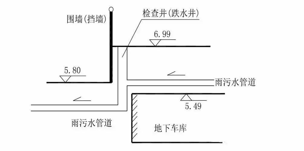 針對項(xiàng)目地下管線需跨越地庫、小區(qū)環(huán)路、市政道路3個標(biāo)高,小區(qū)雨污水管無法直接排入市政管網(wǎng),設(shè)計(jì)上選用跌水井,如圖。