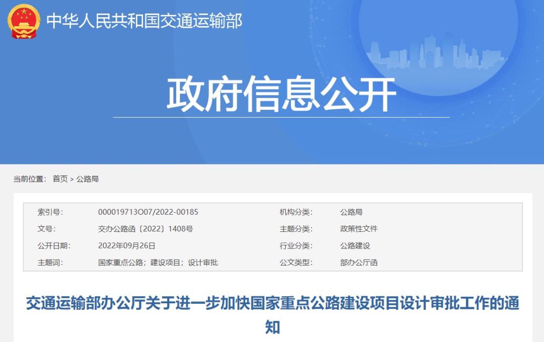 為深入貫徹黨中央、國務院關于深化“放管服”改革工作部署和擴大交通有效投資穩定經濟增長有關要求,依據《國務院關于加快推進政務服務標準化規范化便利化的指導意見》(國發〔2022〕5號)、《交通運輸部辦公廳關于進一步做好國家重點公路建設項目初步設計審批工作的通知》(交辦公路〔2019〕67號)等,經交通運輸部同意,現就進一步加快國家重點公路建設項目設計審批工作通知如下: