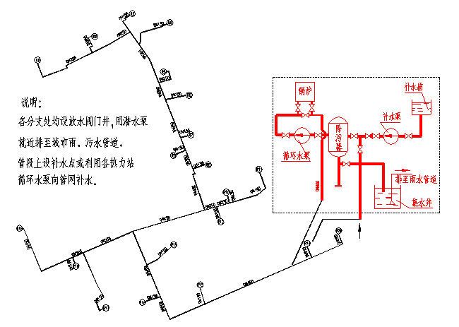 熱水網(wǎng)干線設(shè)分段閥門。輸送干線2~3km;輸配干線1~1.5km。