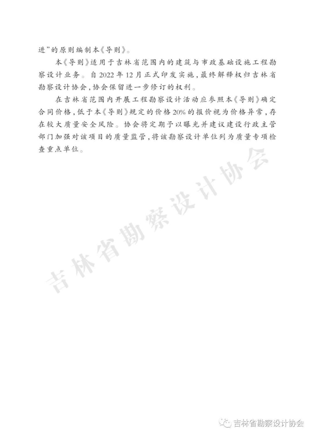 為貫徹落實省住建廳《關于推進勘察設計行業高質量發展的指導意見》(吉建辦〔2022〕66號)文件精神,加強行業自律,維護健康市場秩序,打造公平有序的競爭環境,在業務主管部門的指導下,協會組織相關專家,依據住建部《關于推進建筑業發展和改革的若干意見》(建市〔2014〕92號)、發改委《關于進一步放開建設項目專業服務價格的通知》(發改價格〔2015〕299號)和《工程勘察設計收費標準》(計價格〔2002〕10號)等文件,對《吉林省建筑工程勘察設計收費指導價(試行)》(吉勘設協字〔2016〕10號)予以修編,形成《吉林省工程勘察設計收費導則(2022版)》,現印發給你們,請參照執行。