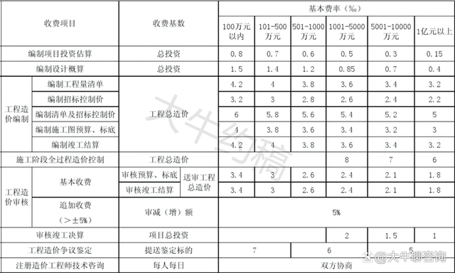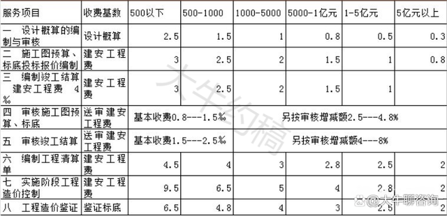 1、表中“工程預(yù)算、結(jié)算、標(biāo)底審核”和“工程量清單結(jié)算審核”項(xiàng)目的計(jì)費(fèi)方式為(1)+(2)。其中審增額向施工單位收取咨詢費(fèi),審減額向建設(shè)單位收取咨詢費(fèi)。凡工程審減率超過(guò)10%的,其超過(guò)部分咨詢費(fèi)用 施工單位承擔(dān),無(wú)審核增減額的,按基本收費(fèi)收取。咨詢服務(wù)費(fèi)一律由委托單位支付;