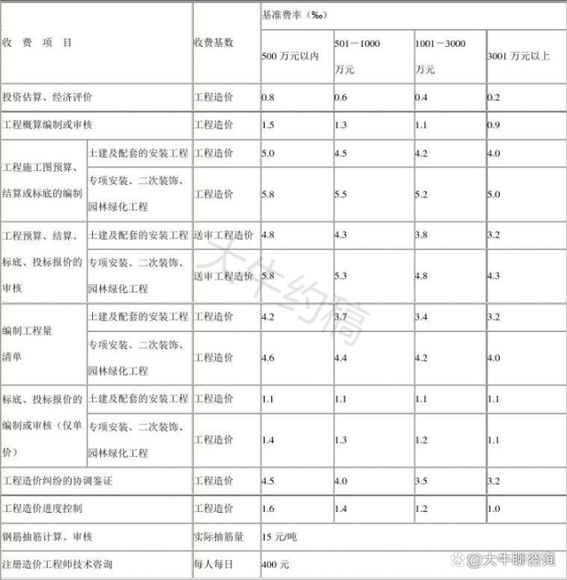 4.工程造價(jià)咨詢服務(wù)收費(fèi)按照本標(biāo)準(zhǔn)計(jì)算收費(fèi),低于每項(xiàng)3000元的按3000收取,超出3000元時(shí)按本標(biāo)準(zhǔn)收取;