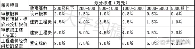 一、上表收費(fèi)按差額定率分檔累進(jìn)法計(jì)費(fèi)。劃分標(biāo)準(zhǔn)為單項(xiàng)工程。當(dāng)咨詢收費(fèi)不足2000元時(shí),按2000元收取;