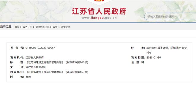 江蘇省人民政府令第 163 號《江蘇省建設工程造價管理辦法》已于2023年1月27日經省人民政府第1次常務會議討論通過,現予公布,自2023年4月1日起施行。
