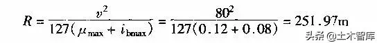 例1-2-1 某平原區二級公路,計算行車速度v=80km/h,試問該公路的極限最小半徑為多少?