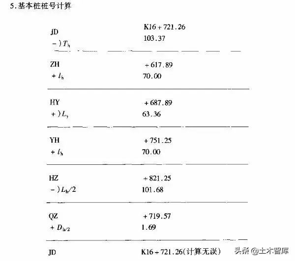 1)在JD處沿兩切線方向分別量取103.37m得平曲線起點(ZH)終點(HZ)的位置;