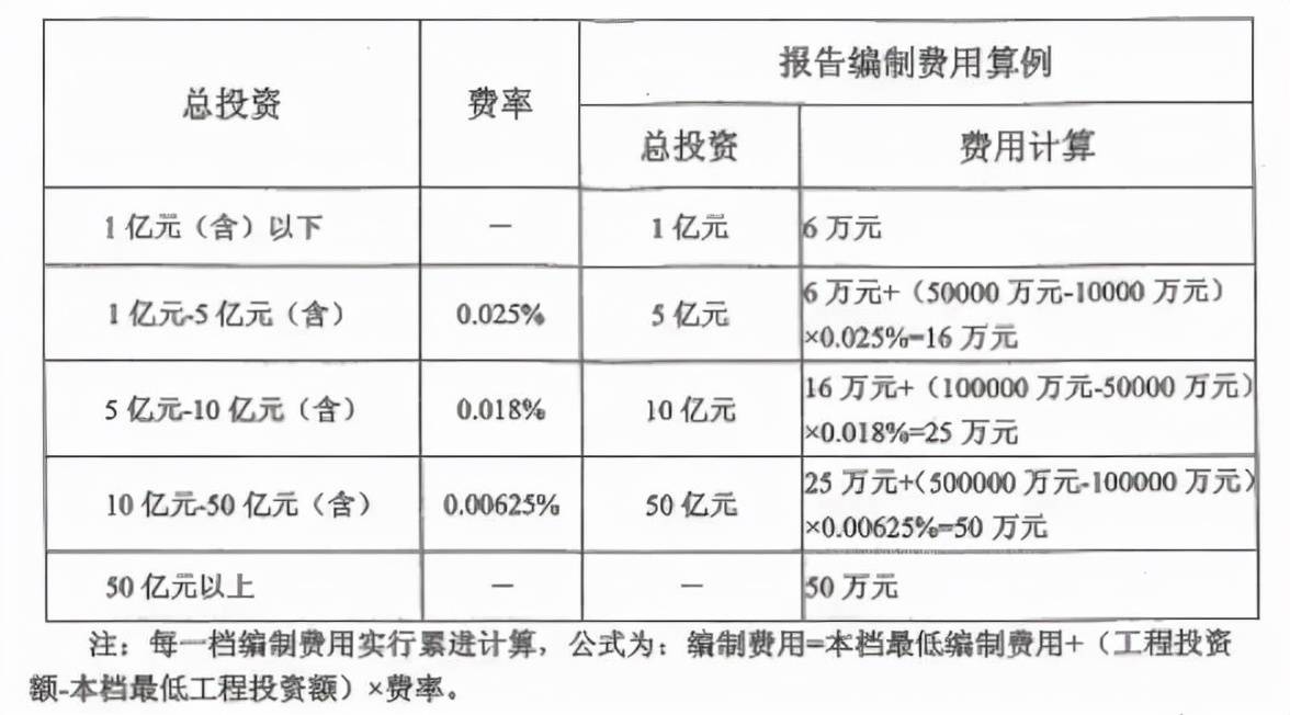 (注:1.分期建設項目每增加一個分期,費用增加1000元;2.建設項目估算投資額是指項目建議書或者可行性研究報告的估算投資額;3.建設項目的具體收費標準,根據估算投資額在相對應的區間內用插入法計算。)