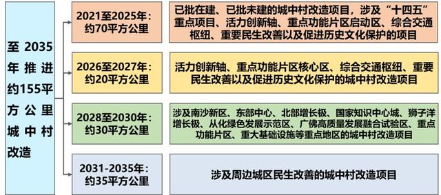 《專項規劃》統籌新增用地與存量用地資源配置,規劃至2025年,累計推進城市更新約130平方公里(含城中村改造70平方公里);至2030年,累計推進城市更新約230平方公里(含城中村改造120平方公里);至2035年累計推進城市更新約300平方公里(含城中村改造155平方公里),通過微改造、混合改造、全面改造多種方式并舉,推動低效存量土地的盤活再利用。
