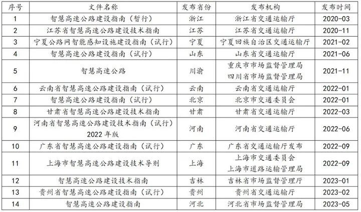 截止目前,全國共有14個省市,發布了智慧公路建設(技術)的指南文件。各省發布時間及文件名稱如表1所示。