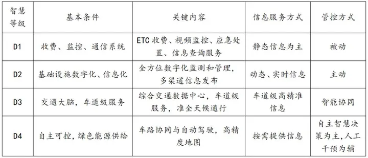 北京市交通委員會發布的《智慧高速公路建設指南》將智慧高速公路總體架構分為智慧化感知、智慧化服務、智慧化管理、智能中臺、云平臺和支撐及保障等六大部分,并以感知能力、處理能力、服務和管理能力為三個維度,將智慧高速劃分為D0-D3四個等級。