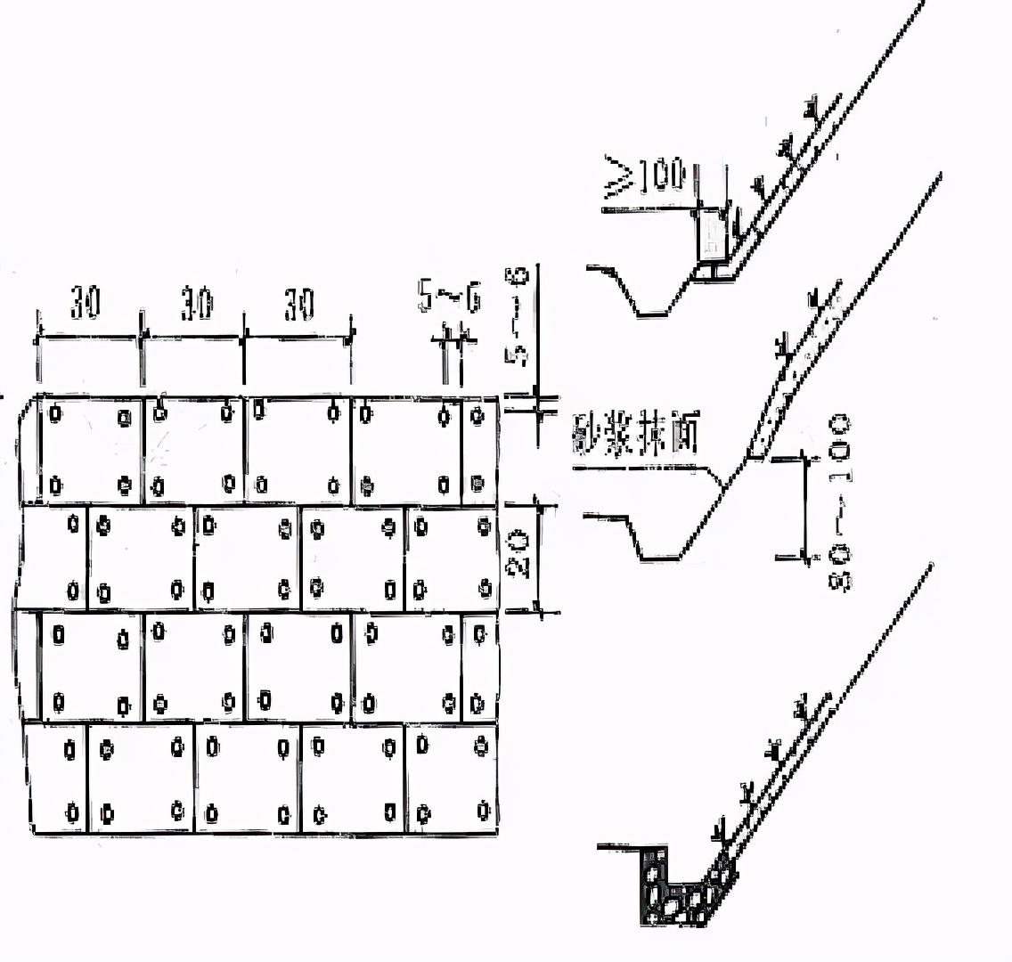 - 坡面防護措施:用于防護開挖邊坡坡面的巖石風化剝落、碎落及少量落石等現象。如砂漿抹面、噴漿、片石護墻、錨桿噴漿等。