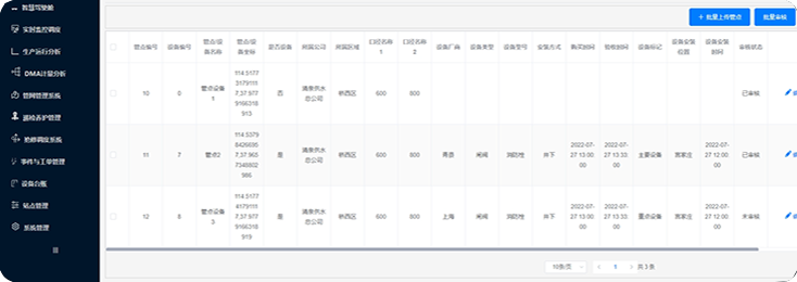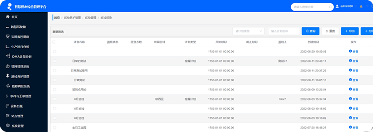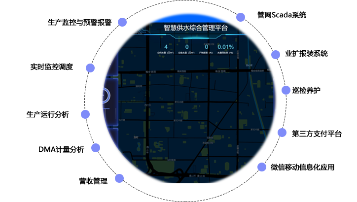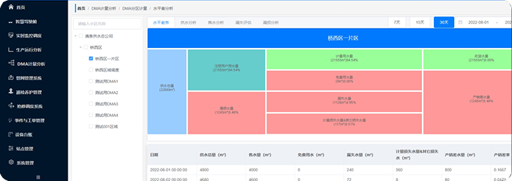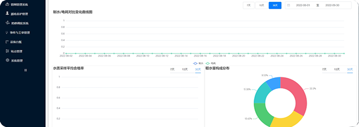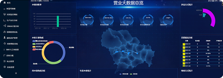 取水分析、消耗產(chǎn)出、水質(zhì)分析、水壓分析、運(yùn)營(yíng)分析、設(shè)備統(tǒng)計(jì)