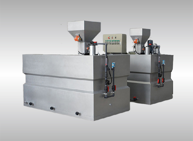 裝置工作原理:干粉絮凝劑加入干粉料斗后,按設定的配比濃度,由螺桿給料機定量輸入溶解箱內,與定量的清水混合,經過攪拌器攪拌、熟化后,由計量泵將混合液外輸至加藥點 。