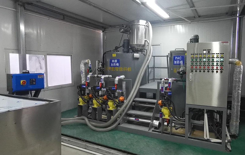 設備包括浸潤器、溶藥攪拌器、加藥泵、稀釋裝置、儀表、管路、管路附件、控制柜。此控制柜既可手動按鈕控制,也可與 PLC控制柜聯動控制。